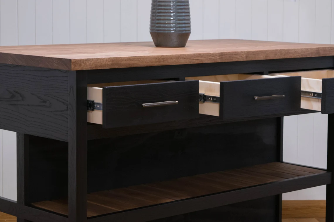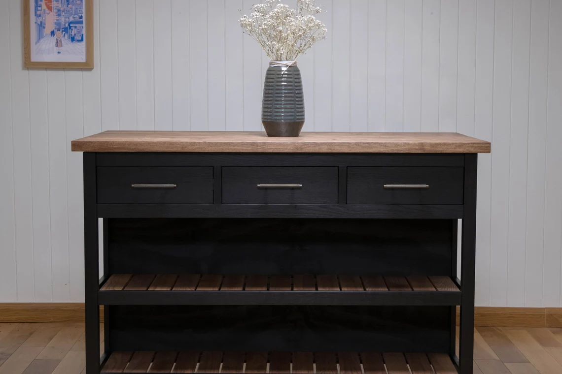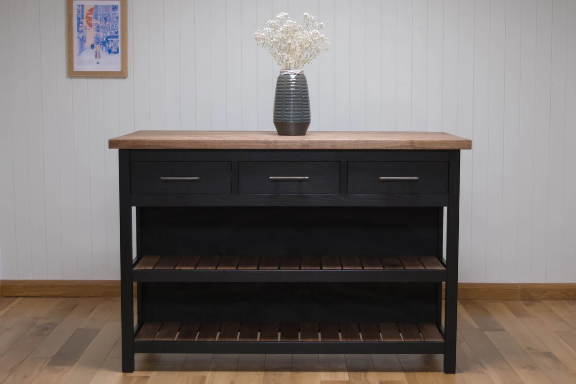 The simple yet striking design of our solid Ash kitchen Island is both bold and beautiful. The Ebonised frame still lets the natural grain of the solid Ash shine through, while providing an extremely functional piece for any kitchen. The pictured unit features on one side, two solid Ash slatted shelves, 3 slow close drawers and on the other side an open breakfast bar, large enough for 2 people. These are made to your required measurements and are bespoke items so each unit will be designed and made to your requirements.